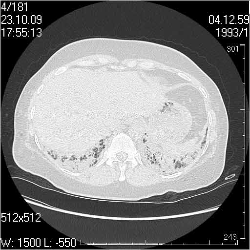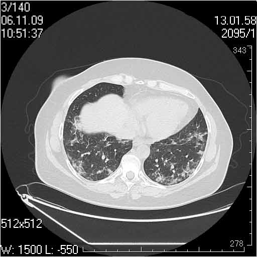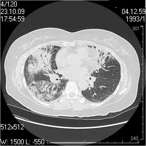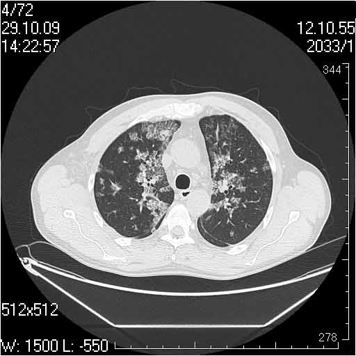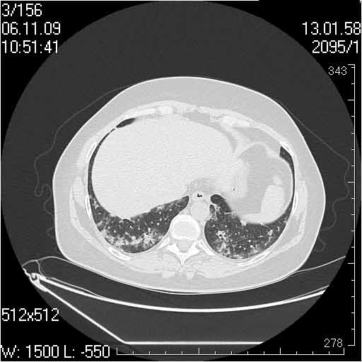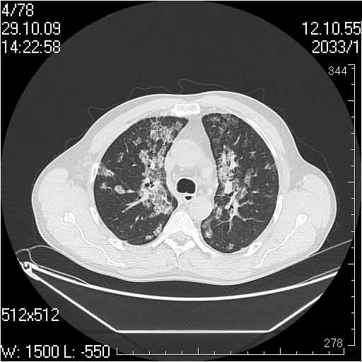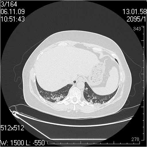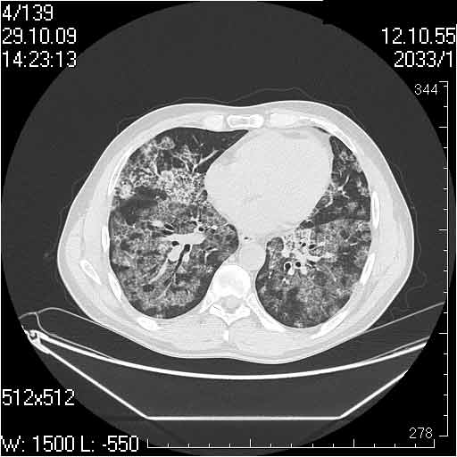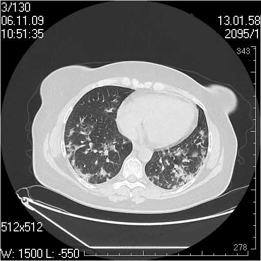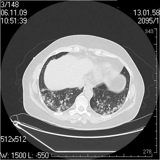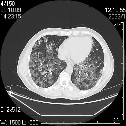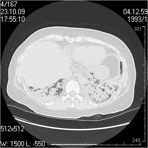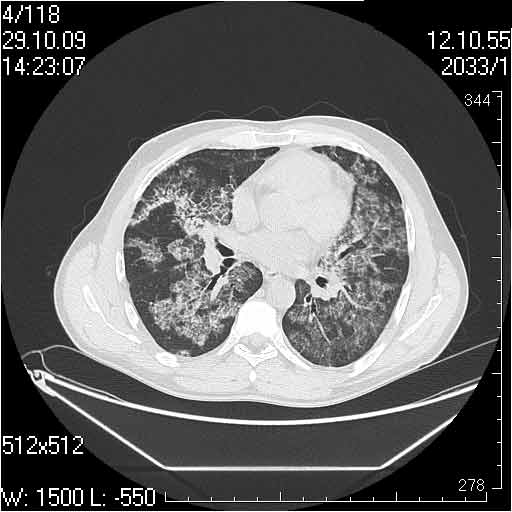 КТ- и рентгенологическая картина диффузного интерстициального поражения легких может сформироваться не только при идиопатическом фиброзирующем альвеолите, но и при самых различных патологических процессах в легких с такими морфологическими субстратами, как альвеолит, интерстициальное воспаление и фиброз, включая: отстаточные явления РДСВ при гриппозной (H1N1) вирусно-бактериальной пневмонии, возможны при других вирусных и бактериальных инфекциях легких, ятрогенного происхождения (реакция на антибиотики, нитрофураны, химио- и лучевую терапию, после длительной килородной терапии, некоторые сердечно-сосудистые средства - амиодарон, апрессин, анаприлин и некоторые другие бета-блокаторы), вследствие токсического действия некоторых газов и паров, аллергии на ингаляционные аллергены при их длительном воздействии, системных заболеваниях соединительной ткани и т.д.