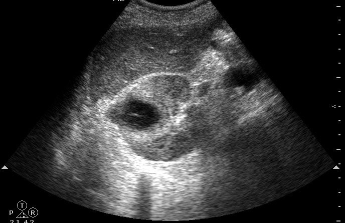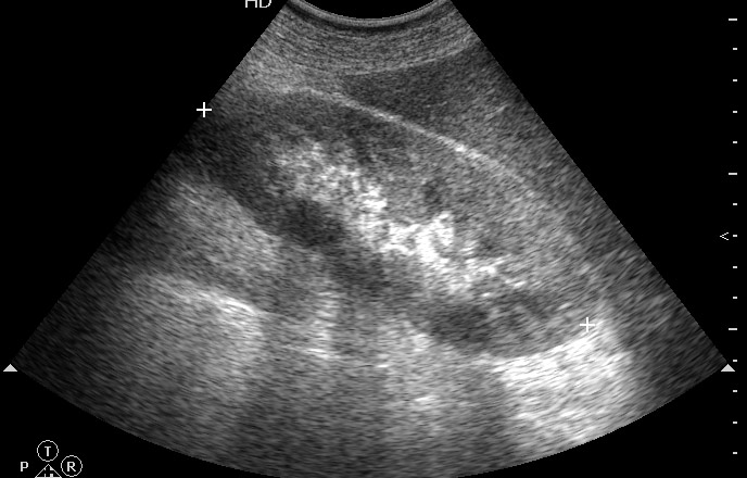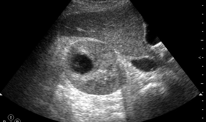 Похоже на абсцесс "прорывающийся" субкапсулярно:отграниченый с толстыми неровными стенками и гипоэхогенной зоной в центре-"расплавление"ткани?(inflamatory рseudotumor) или же renal cell carcinoma с диструкцией в центре(но...скудновата клиника для обоих случаев,ведь нету фона,как сахарный диабет,глубокая старость...),если субфебрилитет,то может быть формирующаяся каверна? Все нуждается в дообследовании-КТ