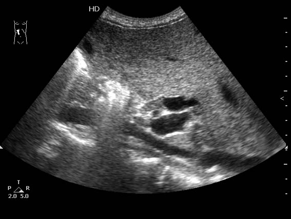конкремента не вижу. желчный пузырь с утолщенными, слоистыми стенками, как при гепатите А, однако печень обычной эхогенности, да и подобные изменения стенок желчного - происходит в дожелтушный период. При этом расширенные желчные протоки и что-то изоэхогенное(Клацкин?)... я в шоке!