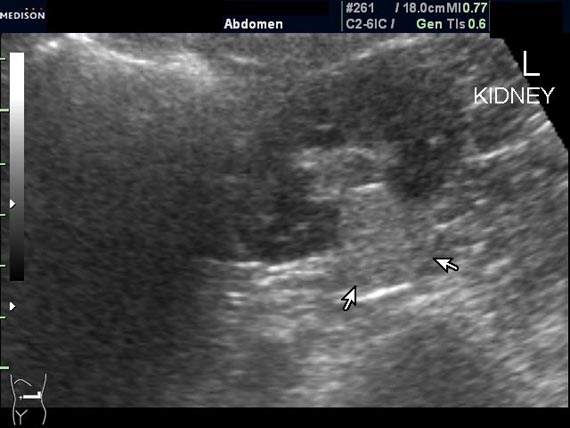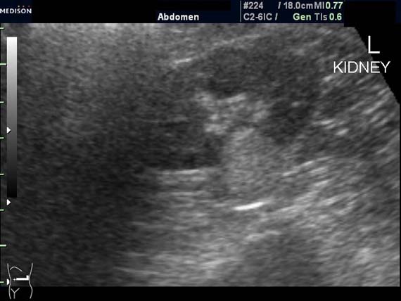 При ультрасонографии ангиомиолипома выглядит как округлое образование без капсулы с однородной внутренней эхоструктурой и четкими контурами; эхогенность ее чаще всего равна или чуть выше эхогенности перинефральной клетчатки [7]. Значительно реже эхогенность ангиомиолипом может быть равна эхогенности почечной паренхимы; такие опухоли состоят почти полностью из гладкомышечной ткани [8]. Иногда позади ангиомиолипомы может определяться слабая акустическая тень.