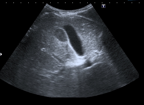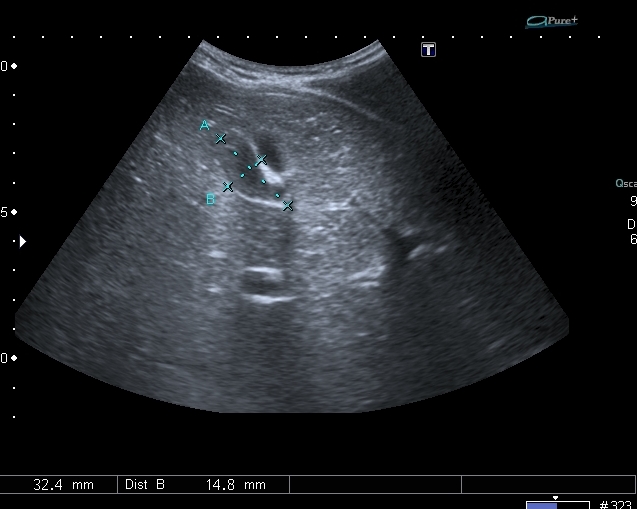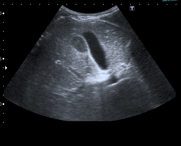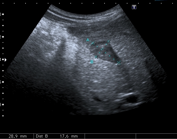 На УЗИ рядом с желчным пузырём определяется овоидное образование солидной струкутры с чёткими контурами.
