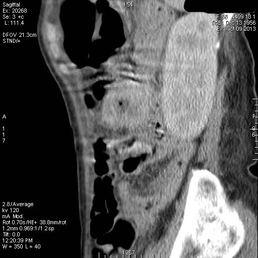 Пальпируется образование в мезогастриуме слева. При УЗИ определяется тумор, не связанный с толстой кишкой.