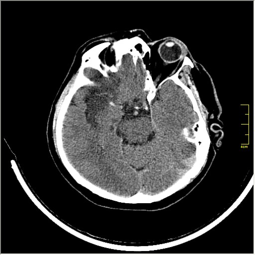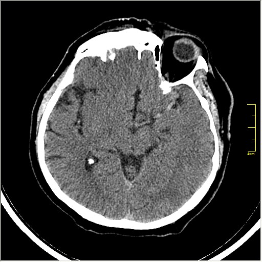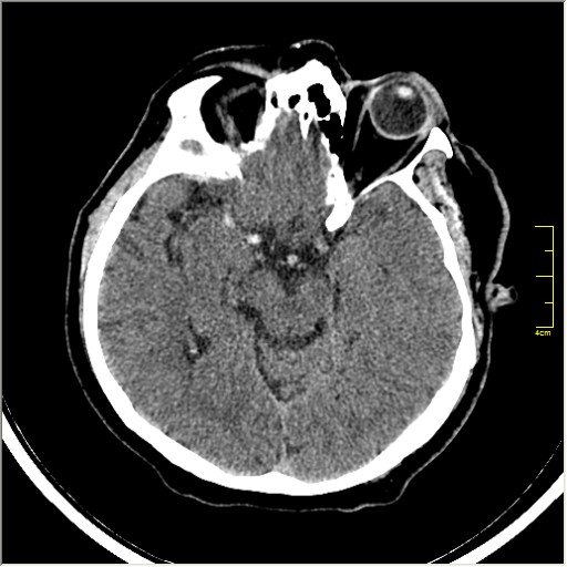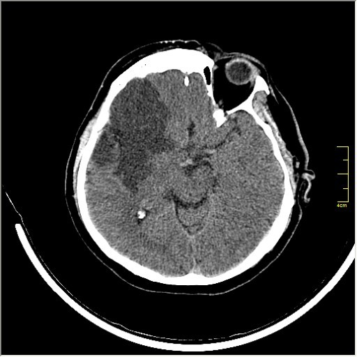 Ответ: Обратите внимание на правую среднемозговую артерию (MCA); М1 сегмент гиперденсен; сравните с другой стороной.