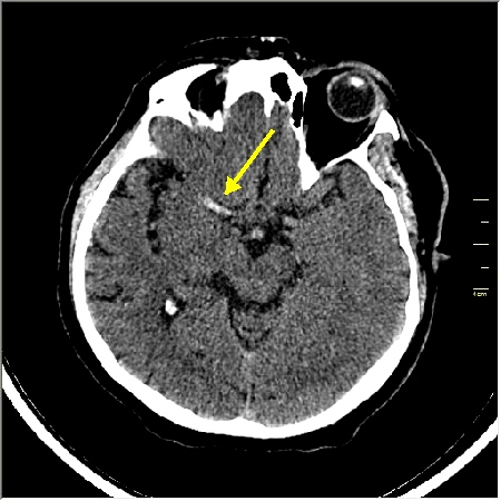 Этот признак называется [Dense MCA sign]; за счёт наличия тромбоза в её просвете. Этот признак является одним из ранних указующих КТ признаков при ишемическом инфаркте головного мозга. Более подробно об этом вы можете прочитать здесь: http://www.radiologyassistant.nl/en/483910a4b6f14.
