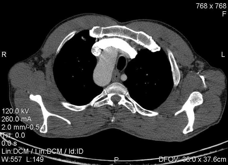 Пациент был направлен на КТ после рентгенографии ОГК, с направительным диагнозом: объёмное образование верхнего средостения.