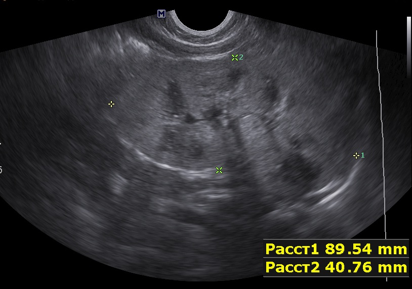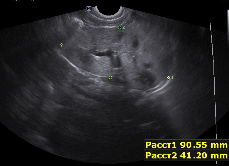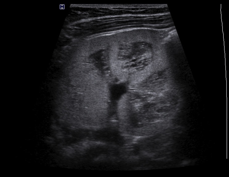 Осмотрен мной ребенок впервые, обращено внимание на большие почки, 90х40мм, паренхима 17-18мм, корковый слой гиперэхогенный, пирамидки дифференцируются. Линейным датчиком определяется: кисты или расширенные канальцы в пирамидках. Структура печени в 1 мес была не изменена, в н.в. отмечается перипортальный фиброз, размеры печени и селезенки увеличены.