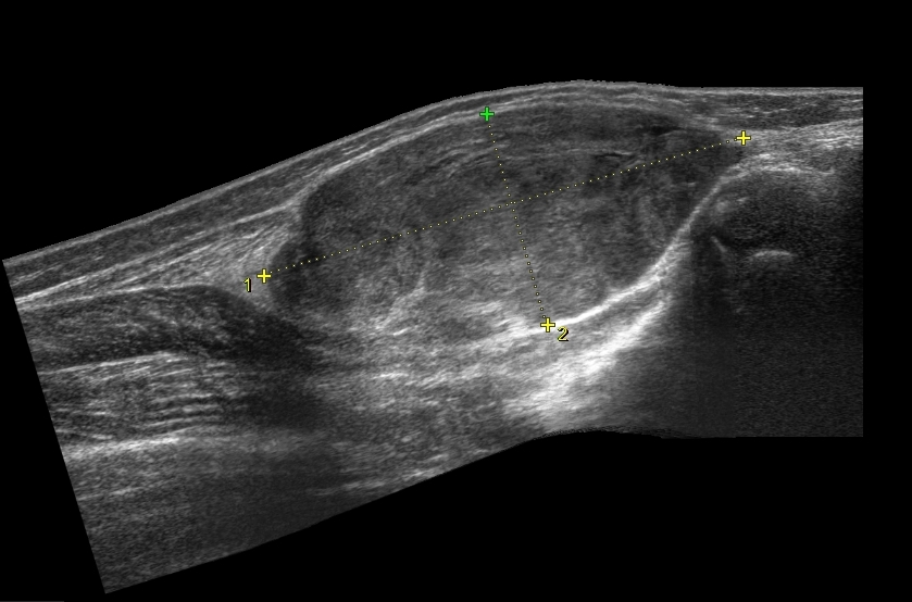 В возрасте 11 месяцев после травмы было отмечено появление образования в мягких тканях в вехней трети. Первично было расценено как гематома, на фоне физиотерапии объем уменьшился, однако через некоторое время отмечено повторное появление образования с постепенным ростом.