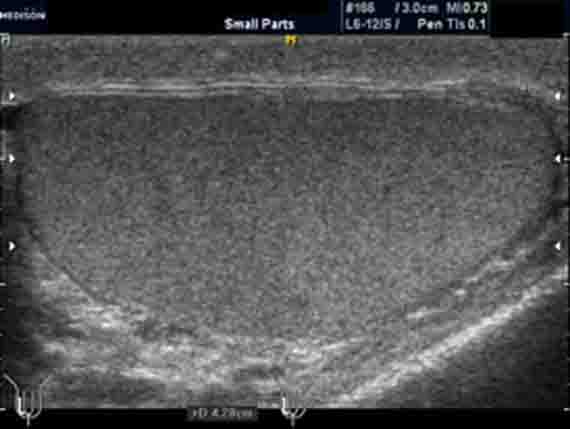 Пациент 42 лет. Направлен на УЗИ мошонки с подозрением на небольшую кисту в придатке яичка. Жалоб нет. Анамнез без особенностей. Пальпаторно мошонка в норме.