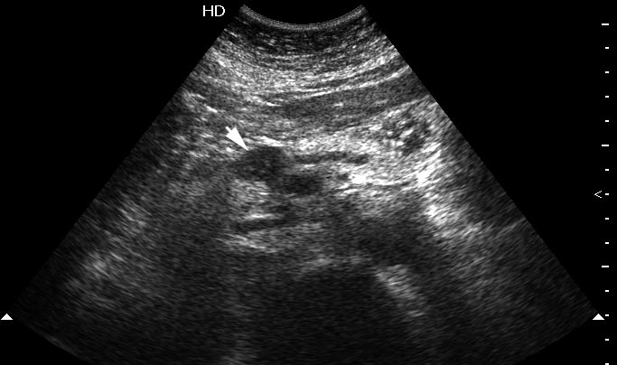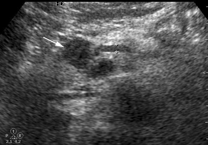 Женщина средних лет, боли в эпигастральной области. На УЗИ выявлено гипоэхогенное образование в области перешейка. Вирсунгов проток слегка расширен. При ЦДК в образовании определяется воспроизводимый кровоток.
