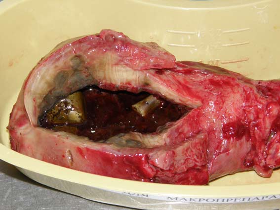 Слизистая ж.п. полнокровна с очагами кровоизлияний и воспалительной инфильтрации, с наличием дефектов в виде изъязвлений с некрозом и гнойным воспалением. Мышечная оболочка утолщена, представлена фиброзной тканью с наличием нейтрофильной (гнойной) инфильтрации с очагами некроза.