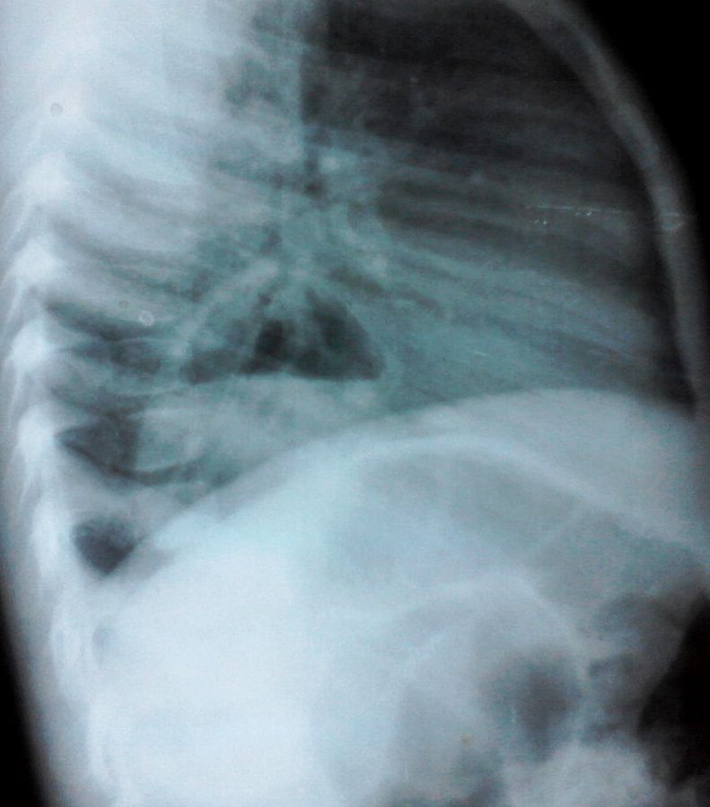 Девочка 4-х лет, жалобы на длительный кашель (оеоло 1-го месяца). В поликлинике выполнена рентгенография органов грудной клетки, выявлены изменения (какие - пока не скажу). Госпитализирована. Направлена на УЗИ сердца. При УЗИ - в самом сердце - патологии не выявлено, но позади него к правому предсердию прилежит полостное образование с акустически неоднородным содержимым.