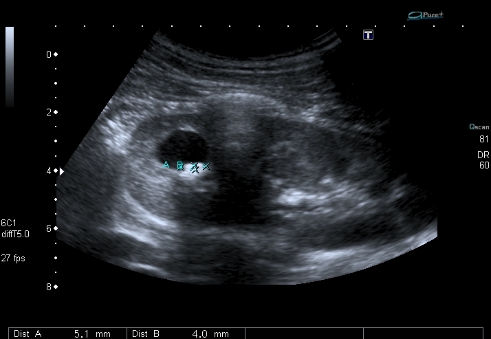 Мальчика выписали без рентгенологического исследования. Будем обходиться УЗИ. Почему это не может быть кистой с конкрементами? Формирование конкрементов в кисте менее вероятно, чем в дивертикуле чашечки или в расширенной чашечке при синроме Фрейли. Но полость уж больно круглая, да и связи с ЧЛС и конфликта с интраренальным сосудом сколько не смотрел, я не увидел.
