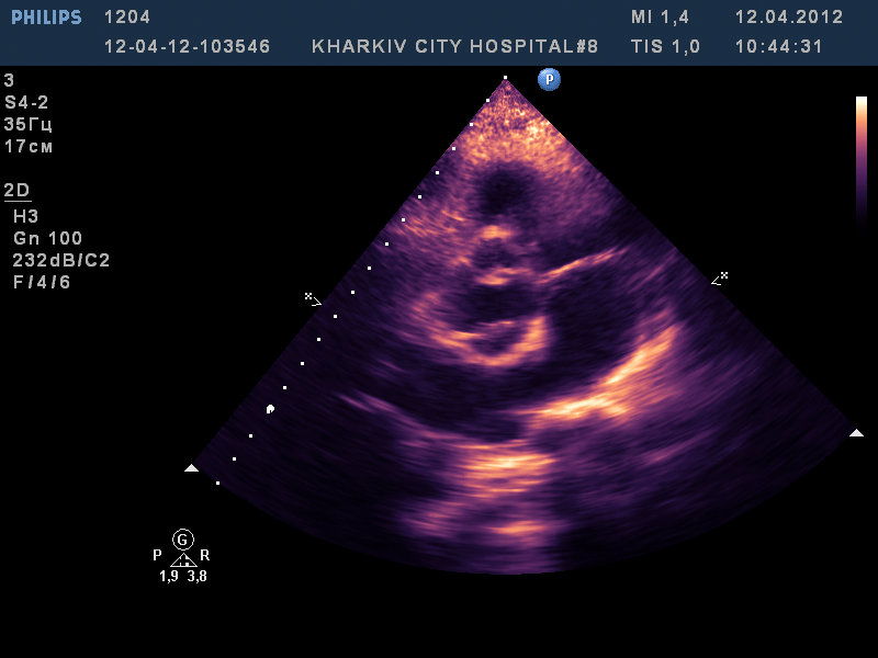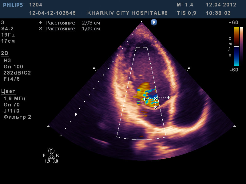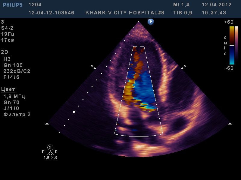 На видео видно двухстворчатый аортальный клапан с неполным смыканием створки с выраженной регургитацией (высокоскоростная струя под углом ударяет в переднюю створку митрального клапана вызывая пролабирование).