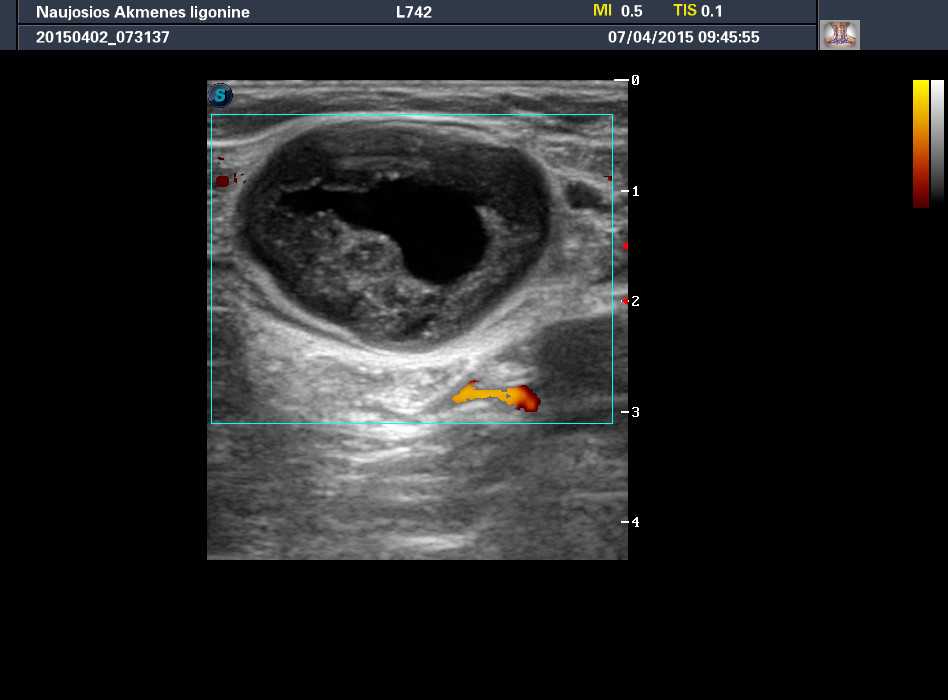 При УЗИ в субингвинальной области слева определяется такое аваскулярное образование: