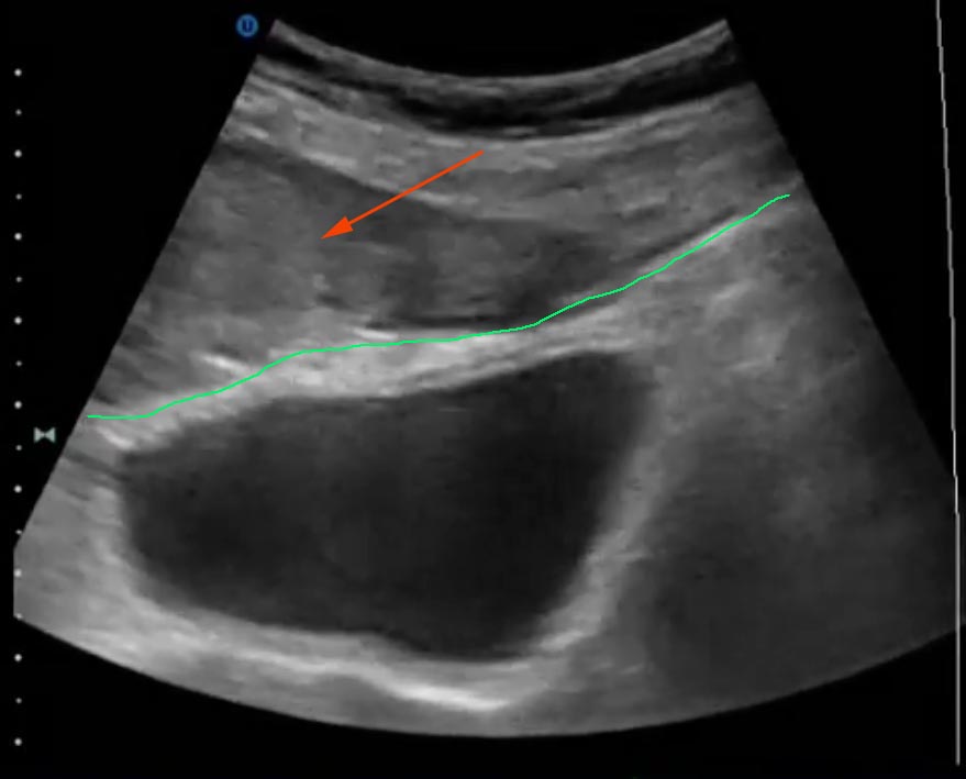 Если брюшина там где я думаю и показана зеленым, то это гематома передней брюшной стенки (сгустки - красная стрелка).