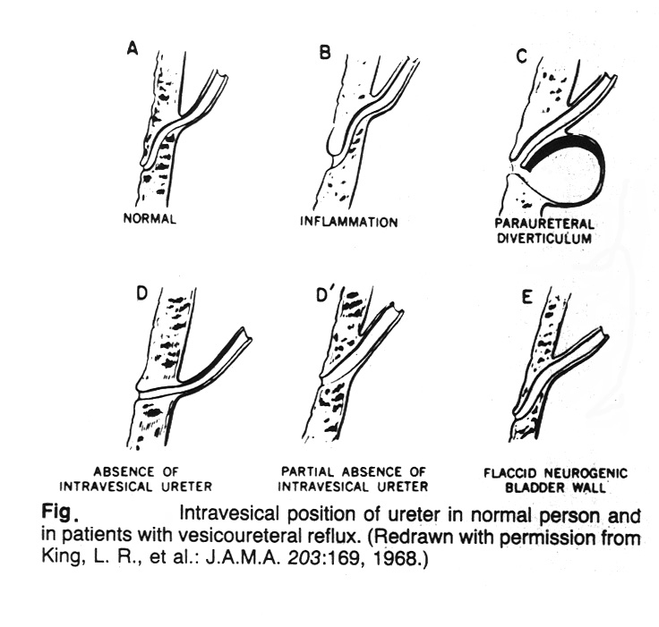 Инфравезикальная обструкция может приводить или сочетаться (при наличии аномалии развития мочеточнико-пузырного сегмента) с ПМР. Механизм развития ПМР связан с морфологическими изменениями МПС при утолщении стенки (своеобразный "вывих" МПС с укорочением интрамурального отдела).
