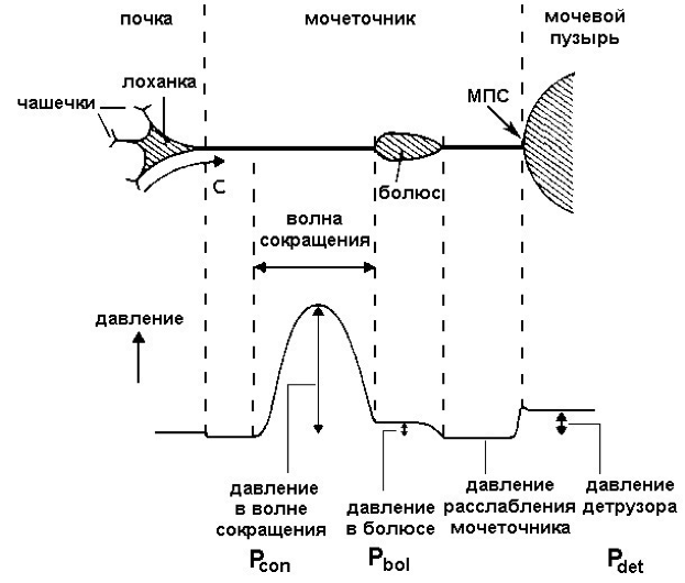 Порция мочи (болюс), попадая в мочеточник, приобретает веретенообразную форму вследствие спиральной формы его мускулатуры и перемещается в дистальном направлении.