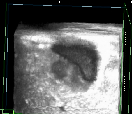На УЗИ рядом с желчным пузырём определяется овоидное образование солидной струкутры с чёткими контурами.