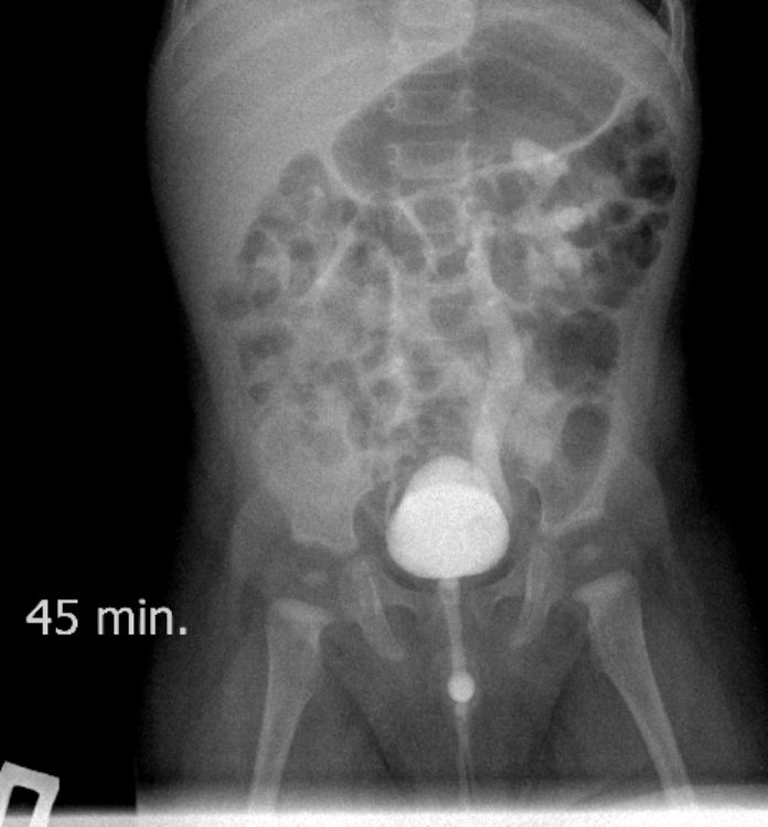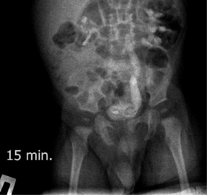 В мочевом пузыре определяется достаточно большое уретероцеле слева, периодически увеличивающееся и пульсационное уретероцеле справа. Левый мочеточник в нижней трети резко расширен.
