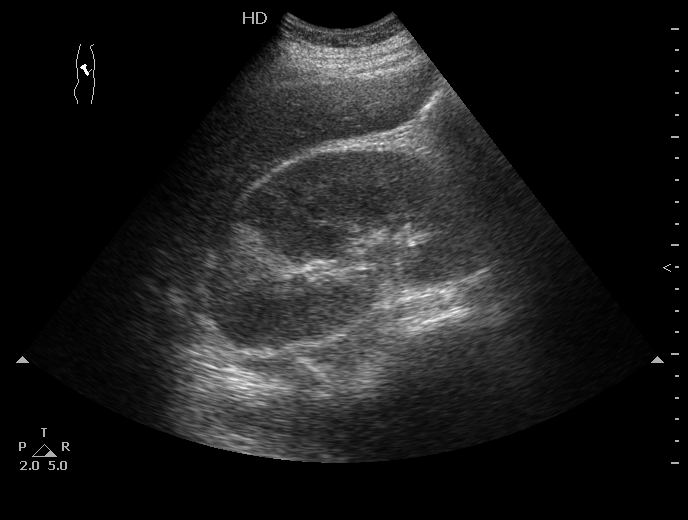 Это - большая почка со сравнительно маленьким центральным эхокомплексом, неравномерно гипоэхогенной паренхимой и отсутствием кортикомедуллярного контраста.
