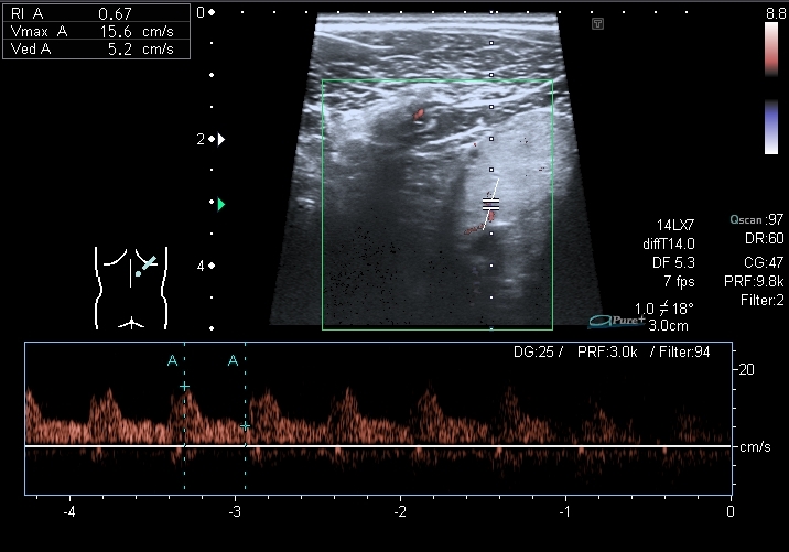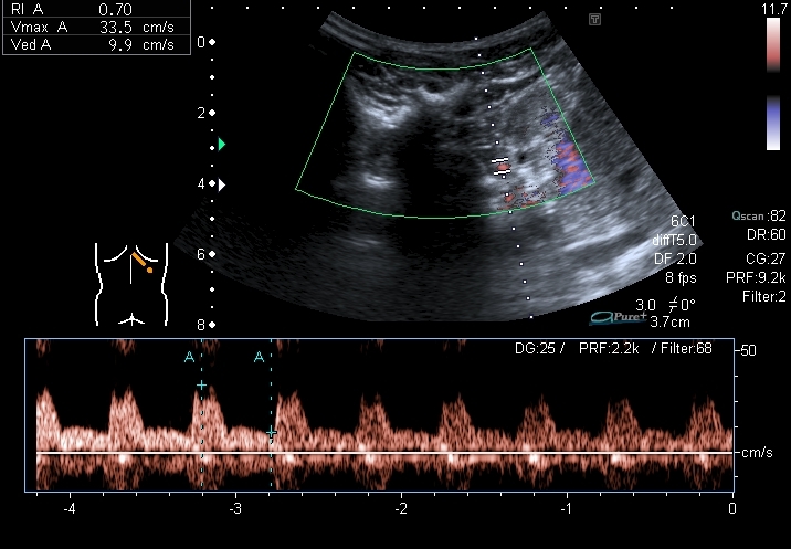 Определяется небольшое расширение лоханок обеих почек, стенки их гиперэхогенные, утолщены. Спектрограммы кровотока в правой и левой почках: Меня больше всего заинтересовало тканевое образование в нижнем полюсе левой почки - гиперэхогенное, многоузловое. Есть мысли про причину такого состояния почек, но пока хочу выслушать мнения коллег. Буду очень благодарен за отзывы.