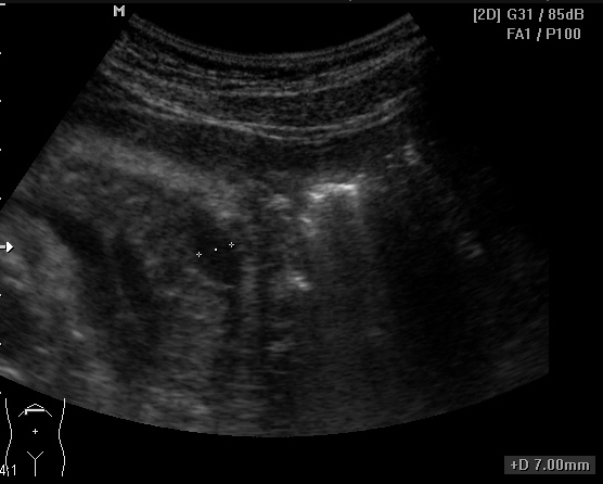 Женщина, 31 год, с умеренной болью в эпигастрии. Беспокоит боль периодически в течение 2 месяцев, усилилась примерно 2 недели назад. ОАК, ОАМ, БАК в норме, температура тела в норме. В малом тазу большое кол-во жидкости мелкодисперстной, особенно кпереди от матки (не сохранила ни скан, ни видео).
