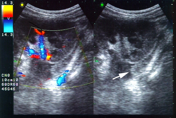 УЗИ: Сгусток крови в ЛМС. Blood clot in renal pelvis, ultrasonography.