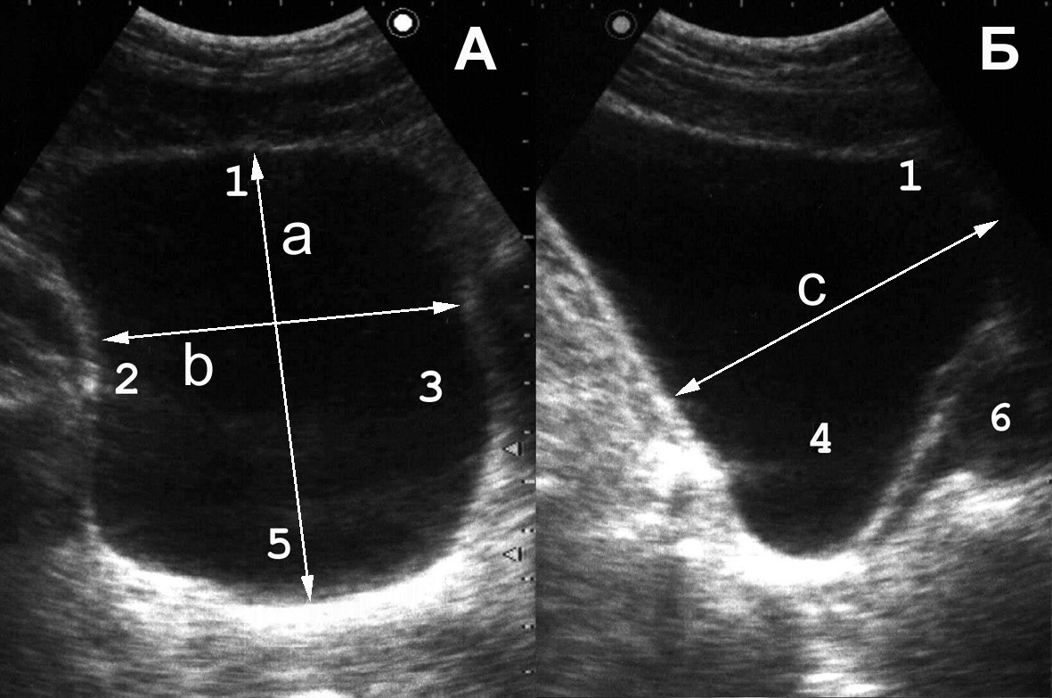 Рис. 1. Сонограмма мочевого пузыря мужчины в норме. Остаточный объем мочи с достаточной для практики точ¬но-стью можно определить по формуле a х b x c x 0,57 [50]. (Поперечное [A] и продольное [Б] сканирование, конвексный датчик 5 МГц, “Logiq-500”).