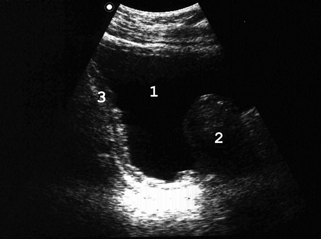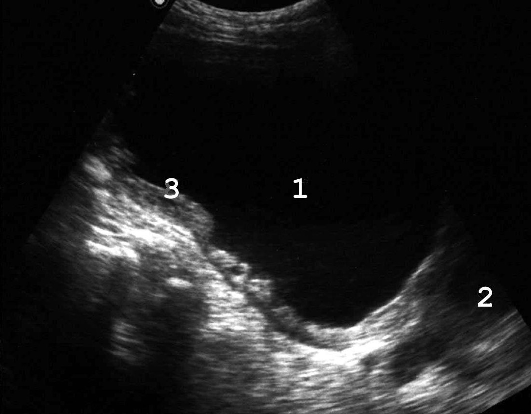 Рис. 5. При хронической задержке мочи вначале развивается гипертрофия мышечной оболочки мочевого пузыря: 1 − мочевой пузырь; 2 − увеличенная простата; 3 − утолщенная стенка мочевого пузыря. (Продольное сканирование, конвексный датчик 5 МГц, “Logiq-500”).