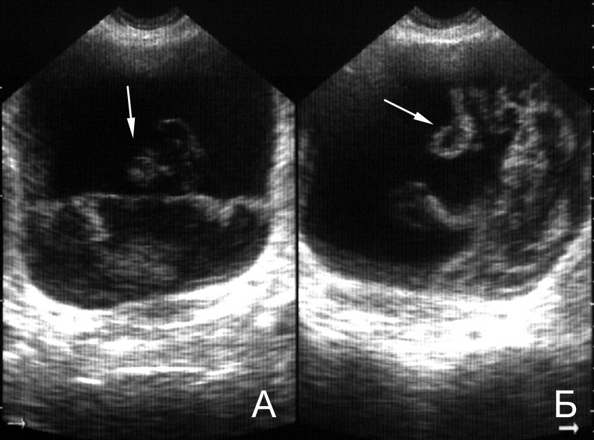 Рис. 17. Мочевой пузырь при цистите, пиурии. Вязкий гной образует причудливые фигуры на дне пузыря, при изменении положения тела он медленно перемещается, почти не меняя формы. (Поперечное сканирование, А − в положении пациента на спине, Б − на левом боку. Конвексный датчик 5 МГц, “Logiq-500”).