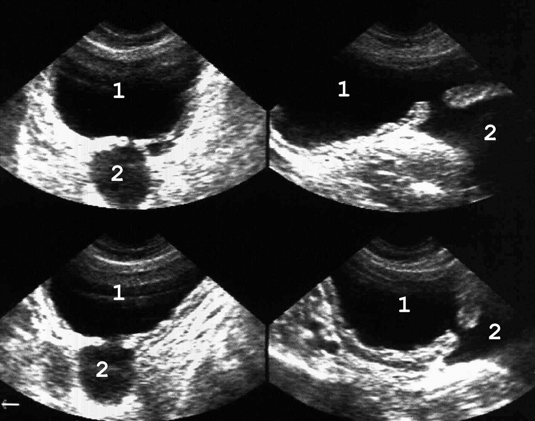 Рис. 2. Сонограмма мочевого пузыря женщины в норме. Ориентиры треугольника Льето: 1 − устья мочеточников; 2 − внутреннее отверстие мочеиспускательного канала. (Попе-речное и продольное сканирование, конвексный датчик 5 МГц, “Logiq-500”).